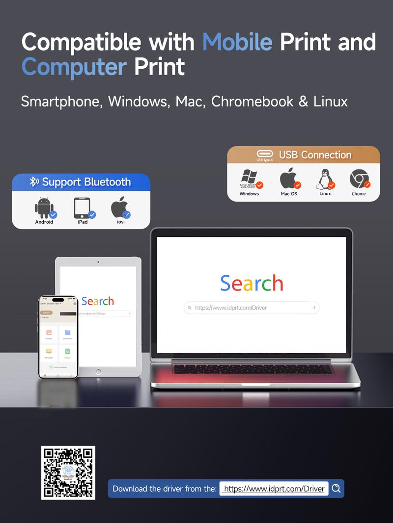 - Easy to use: Easily connects to iOS and Android devices via Bluetooth, and to laptops and computers via USB. The "HerePrint" app simplifies smartphone printing operations, while using a computer requires a driver