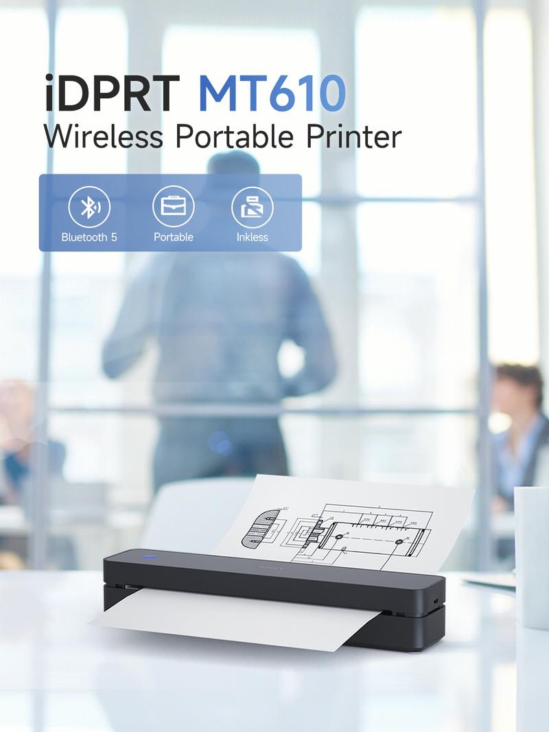 iDPRT Portable Wireless Printer MT610 for Travel Support 8.5" x 11" US Letter Bluetooth Printer. Inkless Thermal Printer for Mobile Phones and PCs - Colour: black