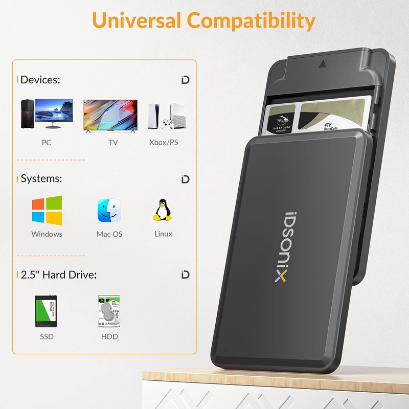 - 【Ultra-fast】: The iDsonix external hard drive enclosure supports TRIM and UASP dual acceleration protocols, providing data transfer speeds of up to 6 Gbps. 1GB of files can be transferred in 2 seconds. It can be quickly connected to your laptop, TV, PS4/5, router, etc.