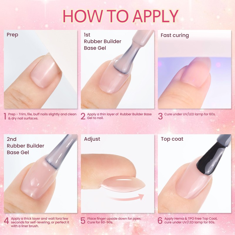 - Easy to apply and lasts long: Start with clean,dry nails,Apply a thin layer of our HEMA & TPO Free 4 in 1 Builder Base Gel and cure under a UV/LED lamp for 60 seconds, Then, add a thicker layer, allowing it to self-level or refine with a liner brush, and cure for 60 o 90 seconds, Finish with our HEMA& TPO Free Top Coat, curing for another 60 seconds, Enjoy salon-quality polished nails!