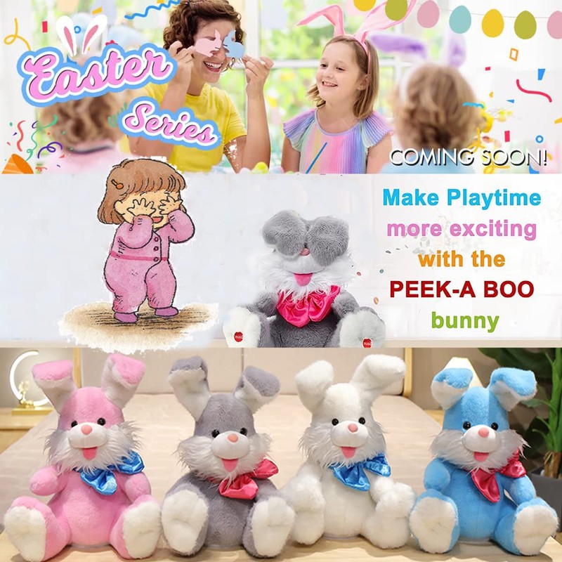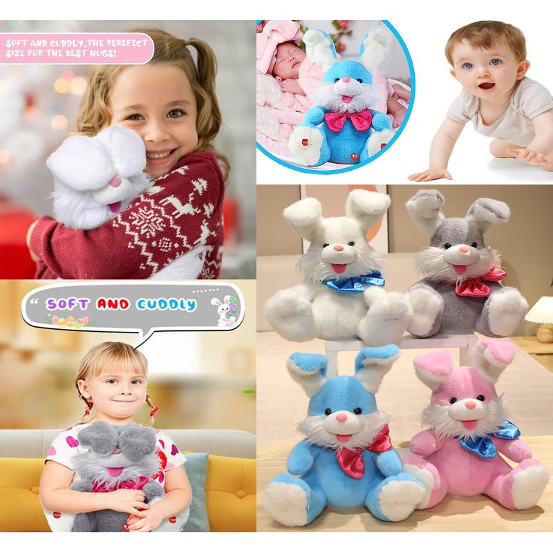 - 🐰 PEEK-A BOO MUSICAL SPEAKING BUNNY: this 4 in 1 vivid stuffed animated bunny is pretty amusing with 4 play modes, [1]play peek-a boo game with the floppy ears flop over its eyes while say "Where'd You Go? Peek A-Boo, I Found You" in Child's voice; [2]singing Child songs; [3]repeat whatever you speaking in his own funny tone; [4] this plush cuddly soft toy is also a huggable furry friend to sooth your baby. This fantastic soft stuffed bunny is hilarious and fun guaranteed!