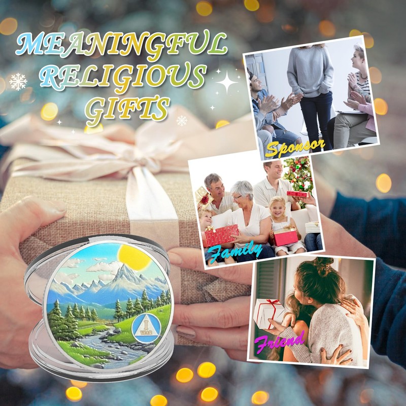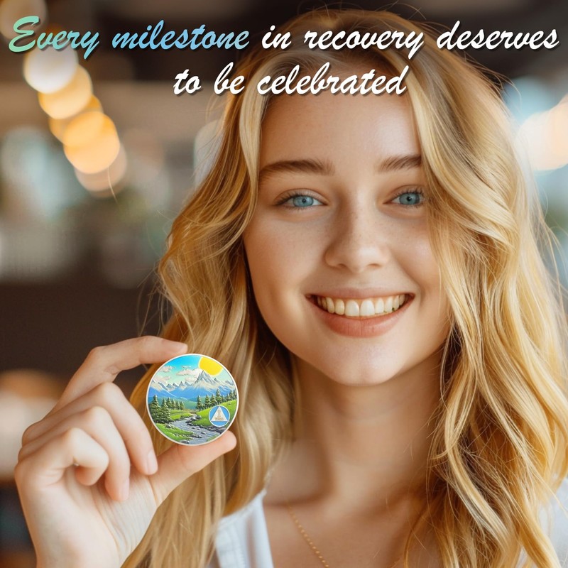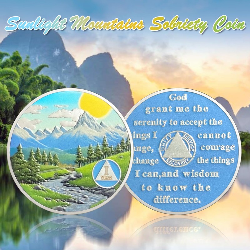 • Celebrating 1 Year of Sobriety: The AA medallion is the perfect symbol for 1 year of sobriety.It depicts a serene and inspiring landscape featuring a sun, mountains, a winding path, green plants, and a river, emphasizing the continuous effort and determination needed to achieve and maintain sobriety. This vibrant and challenging scene represents the journey of recovery, regaining freedom and hope from adversity, and encourages them to continue on the path of sobriety