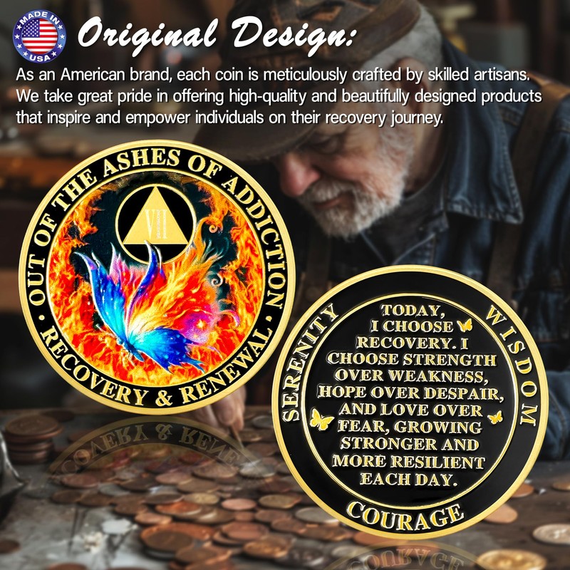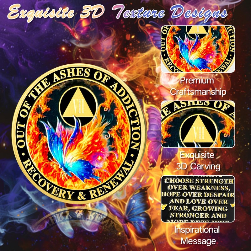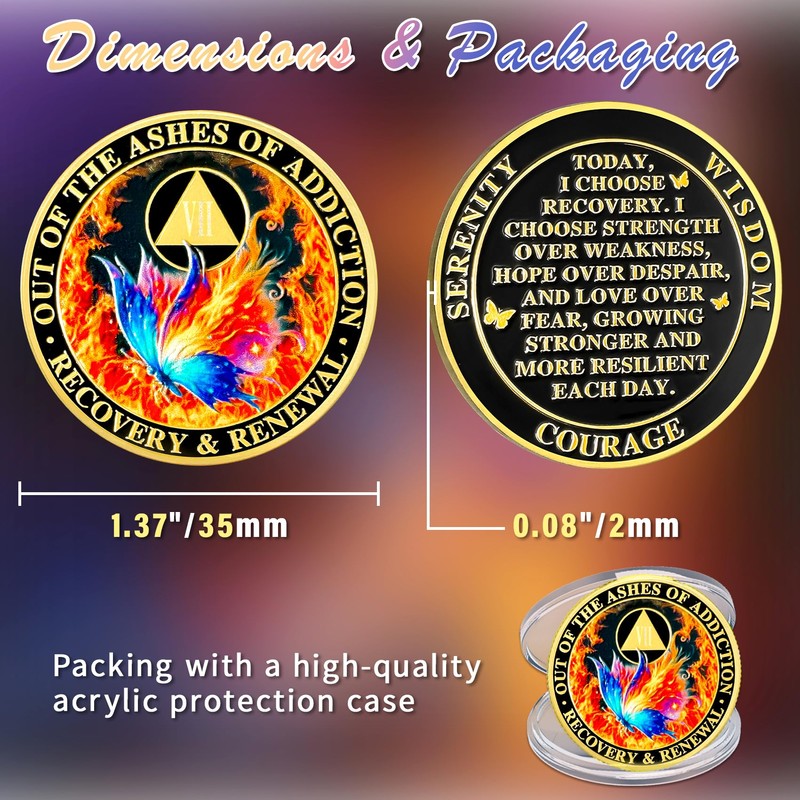 - 7 Year Butterfly Sober Medallions:Butterfly rising from the flames symbolizes overcoming adversity, rebirth and the strength to emerge stronger. Just like a butterfly emerging from its cocoon to regain freedom, embrace a new version of themselves—stronger and more resilient. Butterfly Sober Medallion emphasizes choosing strength, hope and love in the face of addiction and life's challenges, encouraging and supporting those on their recovery journey to pursue a healthier and freer life