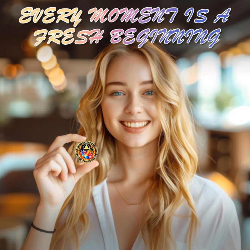- Front of the Sobriety Chip:Features a butterfly soaring out of the flames, symbolizing rebirth and strength. And engraved with the phrases “OUT OF THE ASHES OF ADDICTION” and “RECOVERY & GROWTH,” alongside the AA symbol. The Butterfly represents the power of those in recovery to rise from their struggles or adversity, inspiring the holder to stay committed to their path of recovery, continuously seeking freedom and renewal