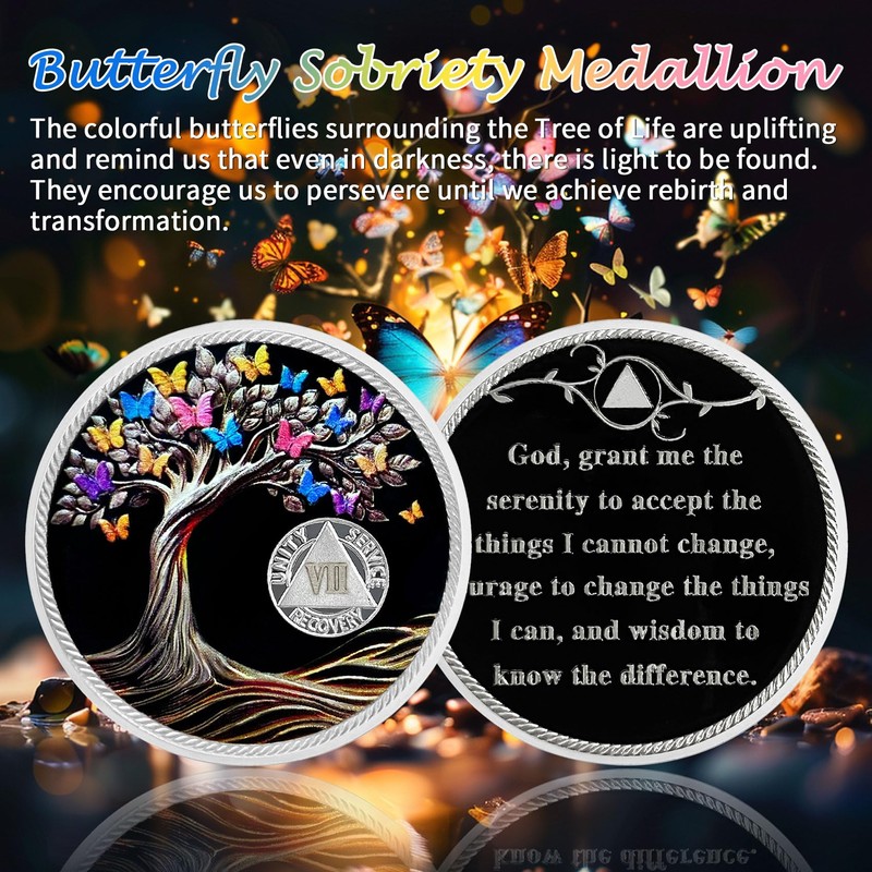 - Celebrate 7 Year of Sobriety: The sobriety medallion is a perfect symbol of celebrating 7 Years of sobriety. The aa coin features a meaningful and inspiring design, depicting an intricate and sturdy Tree of Life surrounded by vibrant colorful butterflies. This vivid and beautiful scene is uplifting, reminding us that even in darkness, light can be found, encouraging us to persevere until we achieve rebirth and transformation - the journey from pain to hope in recovery