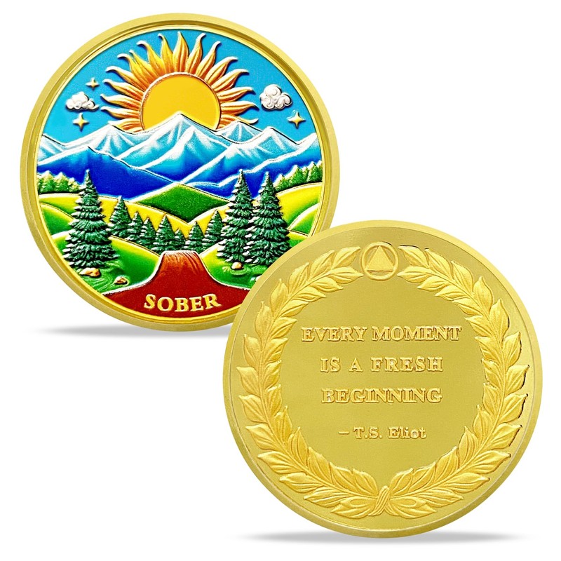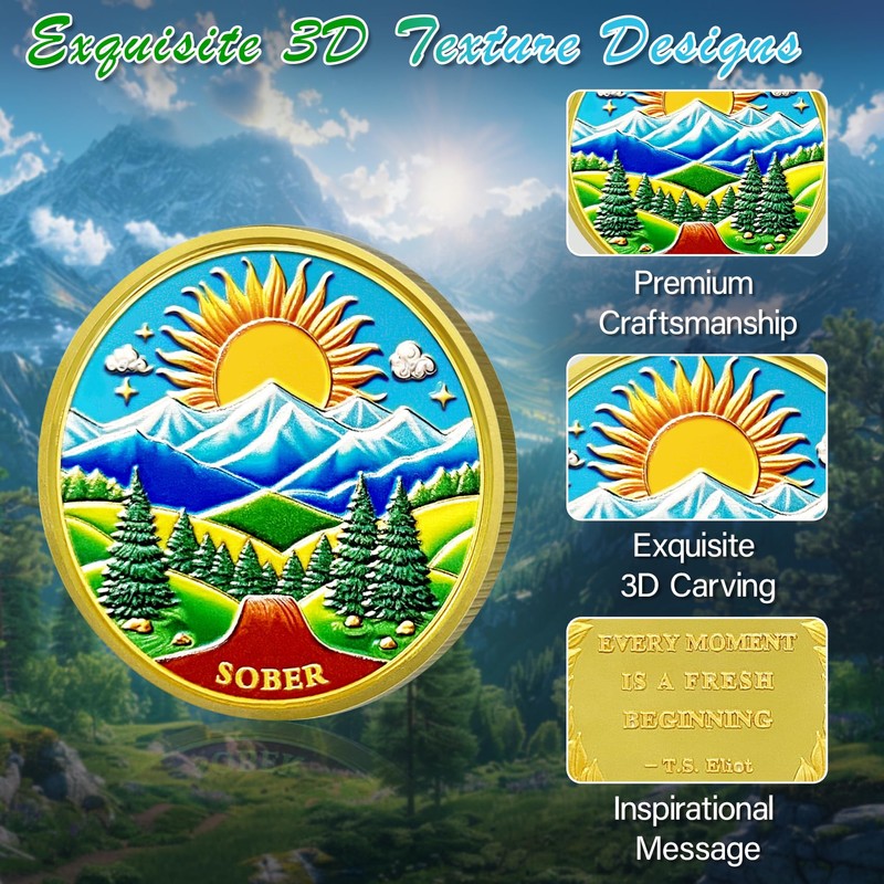 - Celebrating Sobriety: The sobriety coin features an inspiring, artistically crafted natural landscape. With a radiant sun rising above snow-capped mountains, a lush green valley, and towering pine trees, it symbolizes hope, renewal, and the journey of personal growth. This serene landscape represents the journey of those in recovery, rediscovering freedom and hope after overcoming adversity, and motivates them to continue their path toward sobriety