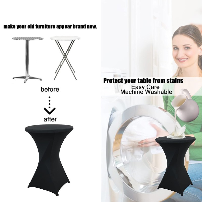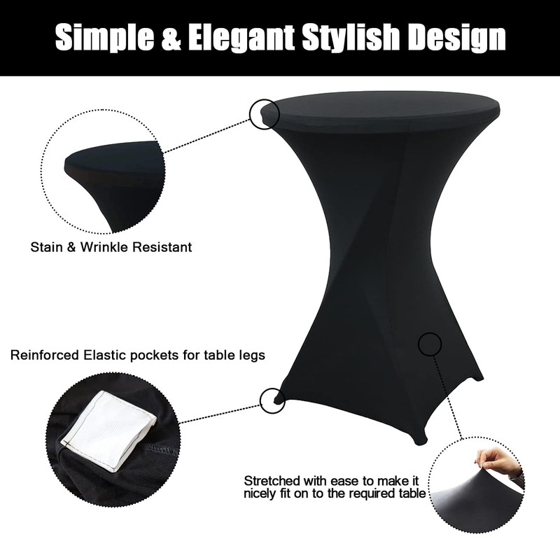 - Feature --- The high spandex fabric makes the tablecloth for cocktail tables more stretchy, so our tablecloths for cocktail tables can shorten your setup time. It can be used both indoors and outdoors. The stretched tablecloths can not only be used for events, but also can be used to make your old furniture brand new.