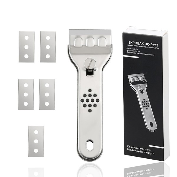 The cleaning scraper is made of high-quality stainless steel and comes with blades. Not only does it make your ceramic hob shine again, but it can also be used to clean your hob. Removes stubborn dirt from otherwise smooth surfaces such as window glass.