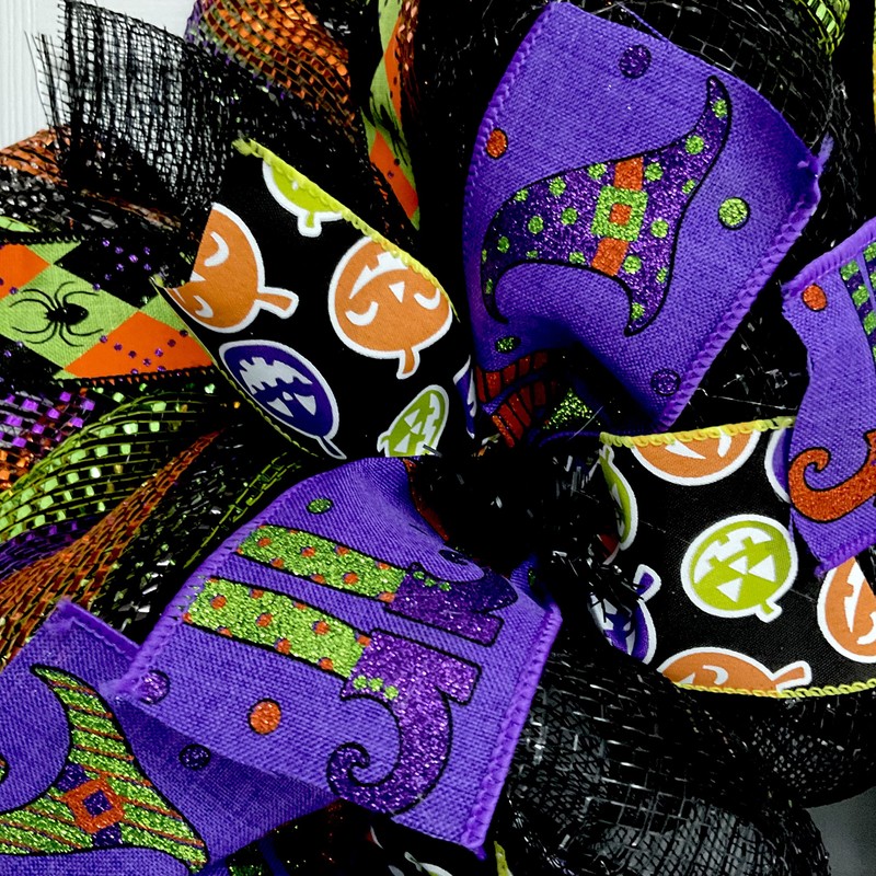 New! black/orange/purple/green metallic deco mesh around the outer ring along with black mesh flutes and spider argyle ribbons. The inner ring has glistening black deco mesh with adorable Witch shoes ribbon and Halloween Jack O'Lantern ribbons. The center of the wreath has a colorful witch boot accent that says “If the Shoe Fits.” The size is 24 inch diameter and 6 inches deep.
