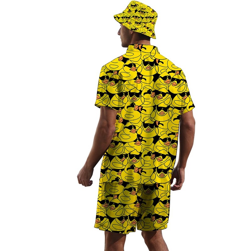 ifamawlea Men's 2 Piece Tracksuit Hawaiian Shirt Shorts Button Down Shirt and Shorts Sets with Bucket Hats, Cute Sunglasses Rubber Duck, Small