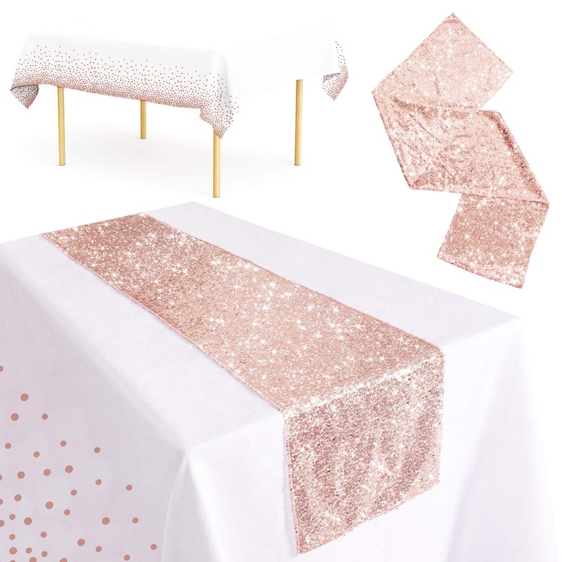 - EVERYTHING INCLUDED:1 Pcs Confetti Plastic Tablecloth Rose Gold 54 X 108 Inches & 1 Pcs Sequin Rose gold Table Runner 12 X 108 Inches, Rectangle