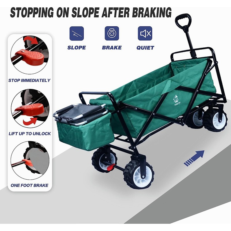 The high-quality brakes are easy to use, and the cart can stop on the slope after stepping on it. It can also pull pets and children, which increases the safety of use. | Super large capacity aluminum frame cooler bag, can be placed in the rear frame of the car to keep your food or drink fresh and insulated, in the summer to pour ice or water into it, can also be insulated and leak-proof | The ergonomic handle makes pulling the cart easier without hurting your fingers, the handle won't fall to the ground when you let go. |