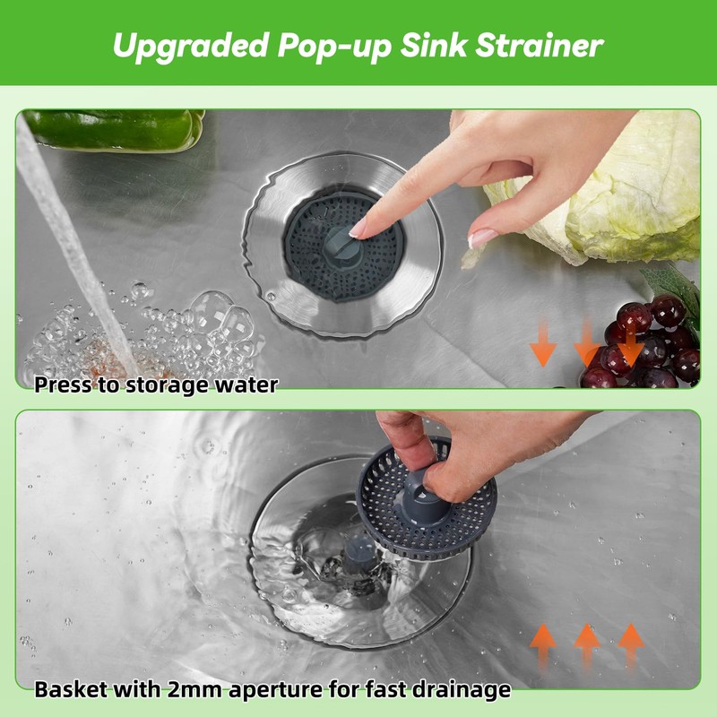 - Leak-Free Performance Sink Drain Strainer: With a sturdy stainless steel base and a spring-loaded handle, just a press of a button and you can trap water instantly. No leaks, no mess-just peace of mind