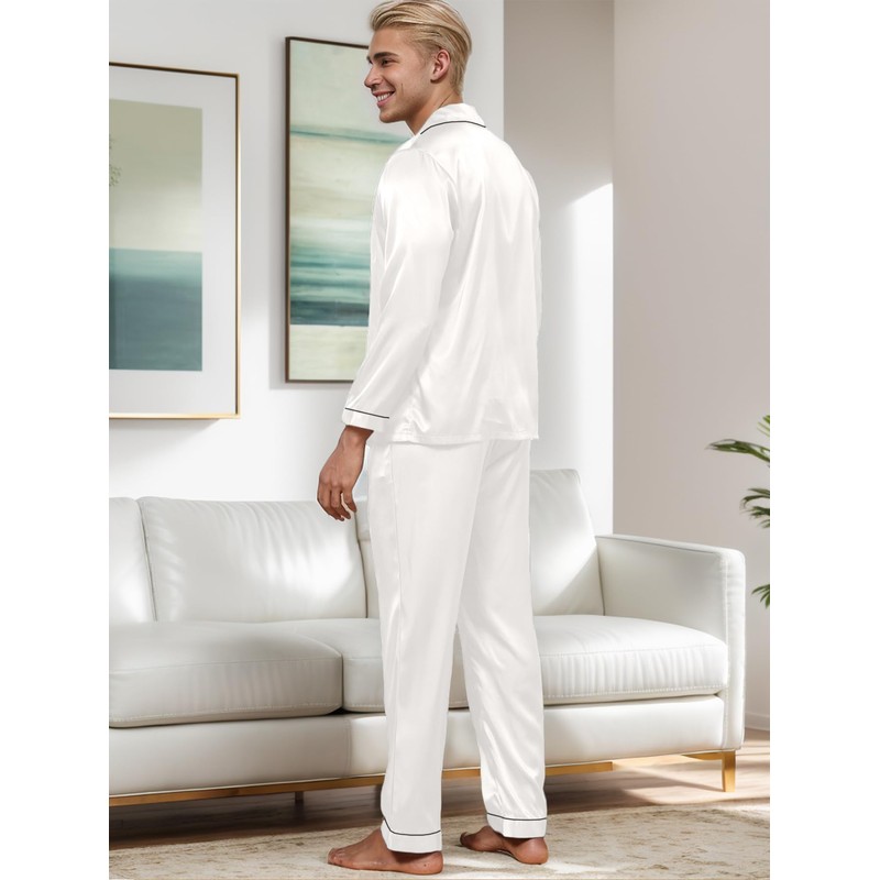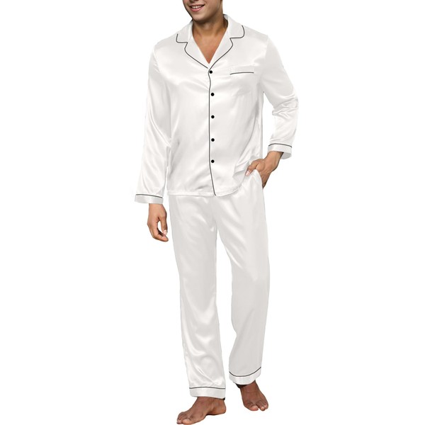 IFFEI Men's Silk Satin Pyjamas Set Long Sleeve Button Down Two Piece Pjs Sleepwear Loungewear XXL White