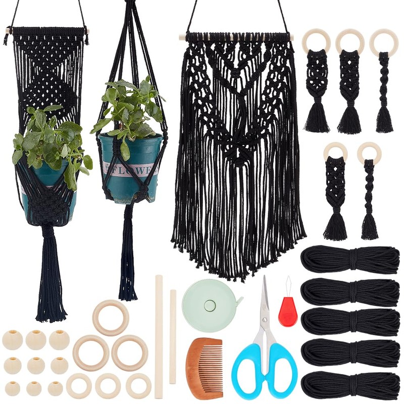 - COMPLETE BEGINNERS KIT: With everything you need, our macrame supplies for adults includes 120m (131 yds) black cotton rope, 10pcs 20mm (0.78 inches) wooden beads, 20pcs of 16mm (0.62 inches) wooden beads, 20pcs of 12mm(0.47inches) wooden beads, 3pcs of 5cm(1.96 inches) wooden rings, 3pcs of 3cm(1.18 inches) wooden rings, 2pcs wooden sticks, scissors, measuring tape, comb, threader.