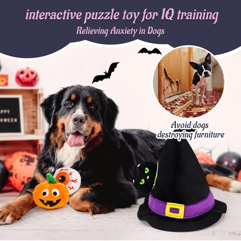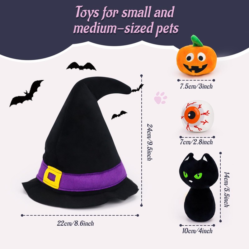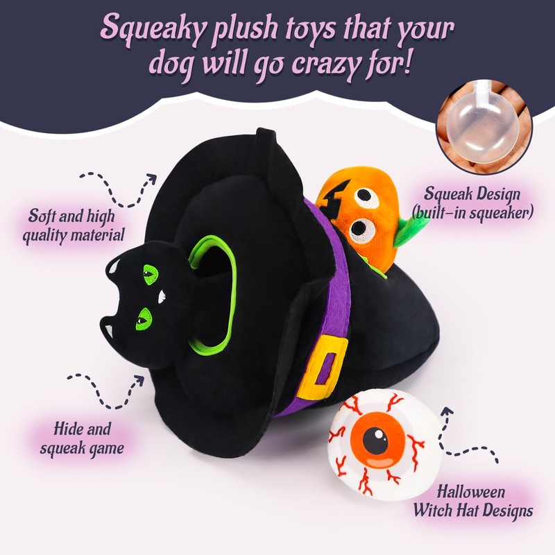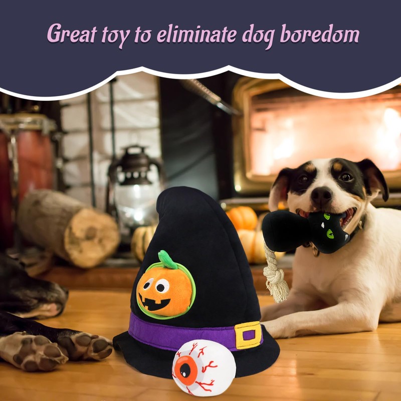 - Exquisite Dog Stuff Set:You will receive dog brain stimulation toys, a combination of 1 Halloween Wizard hats, 1 pumpkin, 1 cat and 1 eyeball—All you have to do is put these toys with squeaky into the hat and let your dog sniff, hunt and fetch them