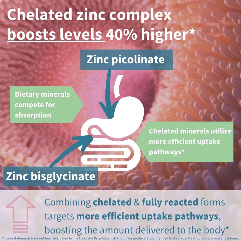 - HIGH ABSORPTION ZINC COMPLEX: fully-reacted zinc picolinate 25mg and glycinate (as bisglycinate) prevent mineral competition by targeting more efficient uptake pathways, boosting levels 40% higher than standard zinc supplements (gluconate)