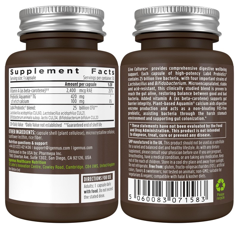 - COMPREHENSIVE DIGESTIVE SUPPORT: manufactured at 50 billion CFU, guaranteed 25 billion probiotic dose at expiry. Prebiotic Aquamin calcium plus vitamin A supports digestion and gut barrier integrity