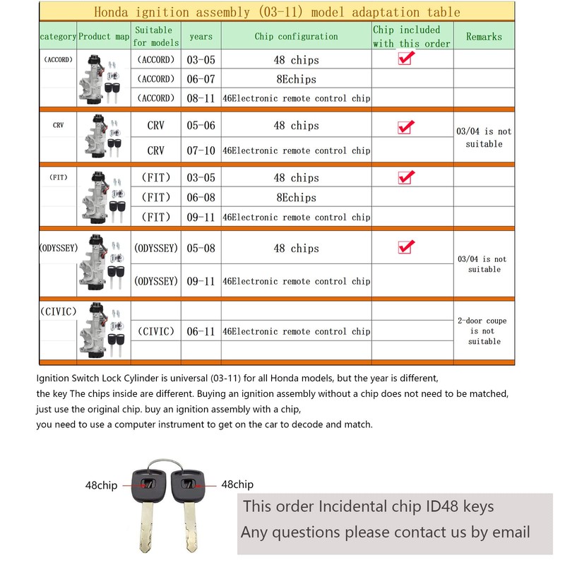 Ignition Switch Lock Cylinder is universal (03-11) for all Honda models, but the year is different, the key The chips inside are different. Buying an ignition assembly without a chip does not need to be matched, just use the original chip. To buy an ignition assembly with a chip, you need to use a computer instrument to get on the car to decode and match. This shop sells chip ID48 keys, please check the model to buy, thank you!