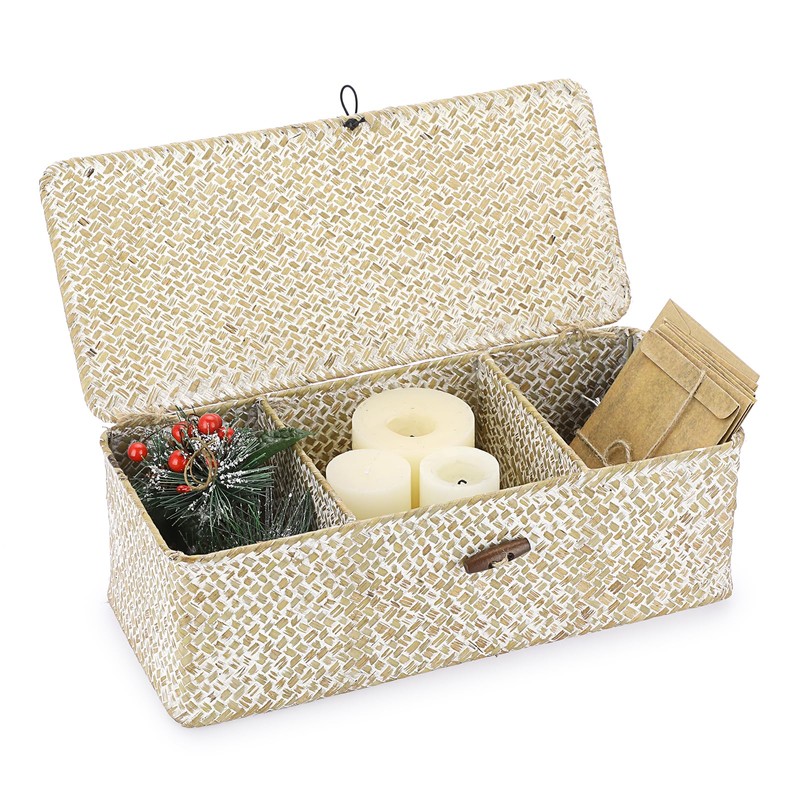 IGNPION 3 Compartments Seagrass Storage Basket with Lid Bathroom Sotrage Toilet Tank Top Basket Woven Seagrass Desktop Basket Rectangular Organiser Box Shelves & Desks Decorative Basket Whitewash