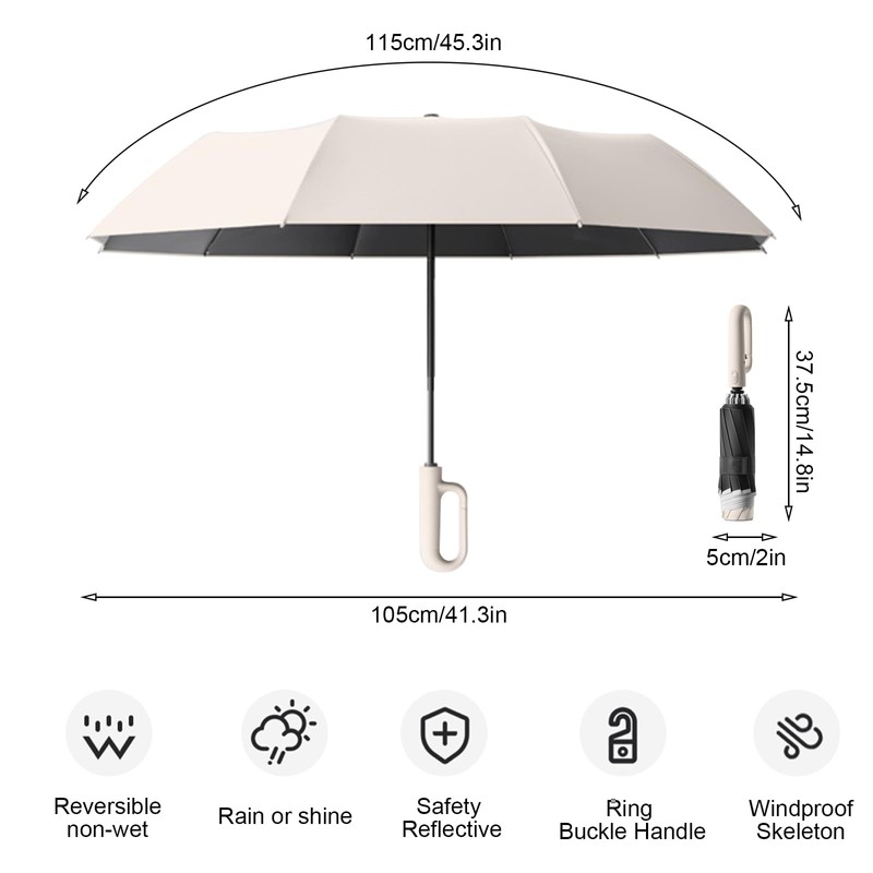 - Inverted umbrella design: Unlike the inward retracting design of ordinary automatic umbrellas, our umbrellas have an inverted design that retracts the wet umbrella surface inside the umbrella, preventing the rain from flowing down, and keeping the floor and car dry when the umbrella is retracted. This design is very convenient when you get out of the car and try to open the umbrella.