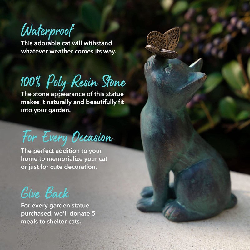 - This statue features a cat staring up at a butterfly resting on its nose with wide, curious eyes. This kitty is the cutest garden decoration, fitting beautifully among any flowers or plants. It’s great for adding a little charm to your yard or for creating a tribute for your late feline.