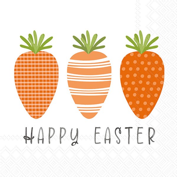 - FESTIVE TABLE DÉCOR Trio of orange carrots on white background, sentiment reads: Happy Easter