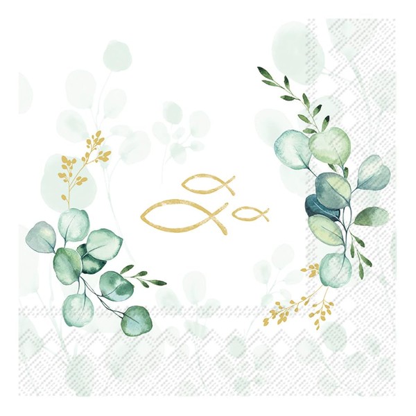 With the napkin "Eucalyptus Fish" you can live out your creativity in a variety of ways. Thanks to the napkin technique, you can transfer the beautiful motif with green eucalyptus and three golden fish to numerous surfaces. Whether on wood, cardboard, cardboard or fabric - the possibilities are endless. For example, create an individual table decoration for a christening or give your home a personal touch with self-designed picture frames. The napkin has a size of 33 x 33 cm and has a quarter motif division. The print is on one side and the back is white, so that the motif is particularly attractive. With 20 pieces in a pack, you have enough napkins for multiple craft projects or celebrations.