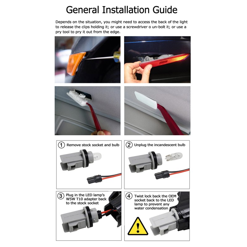 - Install tips: remove the OEM housing from the trunk liner or rear bumper (typically held by fastener clips or screws), detach the bulb from the base, install the LED license plate light adapter, and secure it with black tape to prevent loose connections or water corrosion