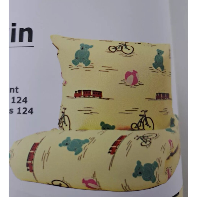 Cheerful yellow set with teddy bear, train and bicycle design.