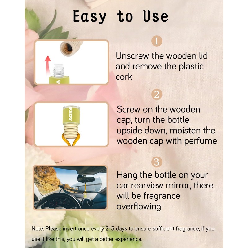 - ??EASY TO USE: Please take off the wooden top cap; Take out the plastic cork in bottle; Recover the wooden top cap; Give the bottle a gentle shake, tip upside down for a couple of seconds to soak the inside of the lid; Adjust the rope and stopper to control fragrance to disperse scent evenly, the aroma of essential oil will through a cotton rope and wooden stopper to emit pleasant smell; Hang this car air freshener anywhere. And enjoy.