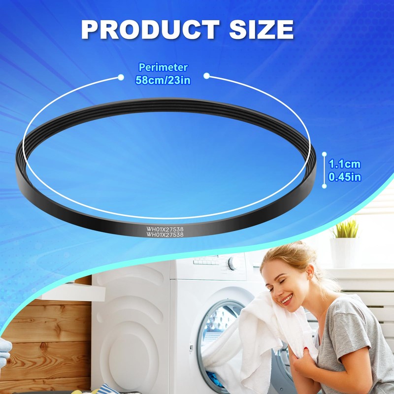 - FIXES SYMPTOMS: Washing machine spins a lot, very slowly or stop spin agitate, noisy, burning smell, it may be a worn/damaged drive belt. The WH01X27538 washer drive belt can solve your problems and save time and money