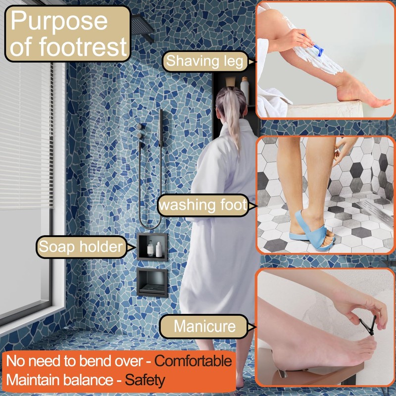 - 【Safe and space saving】:The shower foot stool can be installed at any height - convenient for wiping feet and shaving legs. Recessed wall installation - saves indoor space. Secure installation - safer. The product does not protrude from the wall - it will not bump into your legs. Comes with anti slip pedals.