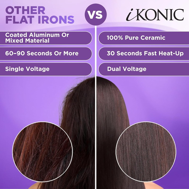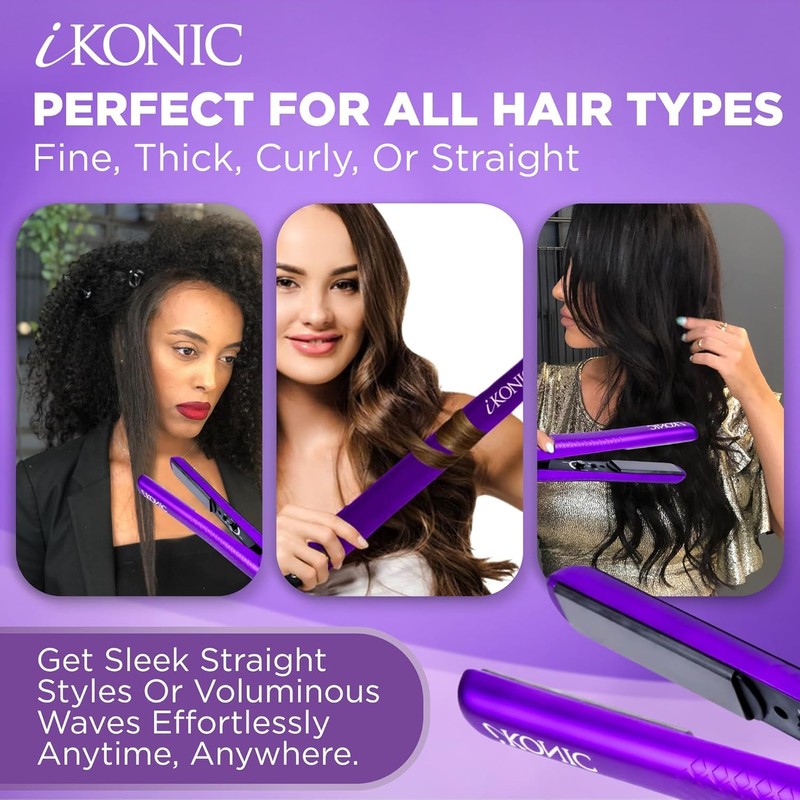 Experience salon-quality styling at your fingertips with the IKONIC 100% Pure Ceramic Hair Straightener – your ultimate tool for sleek, polished, and professional results. Whether you're prepping for a big day or just perfecting your daily look, this professional flat iron transforms your routine with powerful features designed for all hair types and textures. Crafted with advanced ceramic floating plates, this hair straightener ceramic flat iron delivers consistent heat across the hair shaft to reduce frizz, protect shine, and minimize damage. The ultra-smooth surface allows the plates to glide effortlessly, giving you precise control and flawless results with every pass. Whether you’re aiming for pin-straight locks or gentle curves, it functions as a versatile styling tool for both straightening and curling. The IKONIC flat iron heats up in just 30 seconds and offers adjustable temperature control from 140°F to 450°F, making it suitable for everything from fine to coarse hair. Perfect as a hair straightener for women, it adapts to your individual hair needs and styling preferences. Its ergonomic design, lightweight feel, and 360° swivel cord ensure tangle-free movement and comfort during extended styling sessions. Engineered with dual voltage hair straightener capabilities (100-240V), this plancha para cabello profesional is ideal for international travel. The 30-minute automatic shut-off function adds a layer of safety, giving peace of mind to your busy lifestyle. It’s the best flat iron ceramic tool to pack for business trips, vacations, or overnight stays. Whether you're looking for a professional straightener, a plancha de cerámica para cabello, or a dependable flat iron for black women hair, the IKONIC delivers high-end performance with affordability. Trusted by stylists and loved by users, it's a favorite among hair straighteners that rival expensive salon tools.