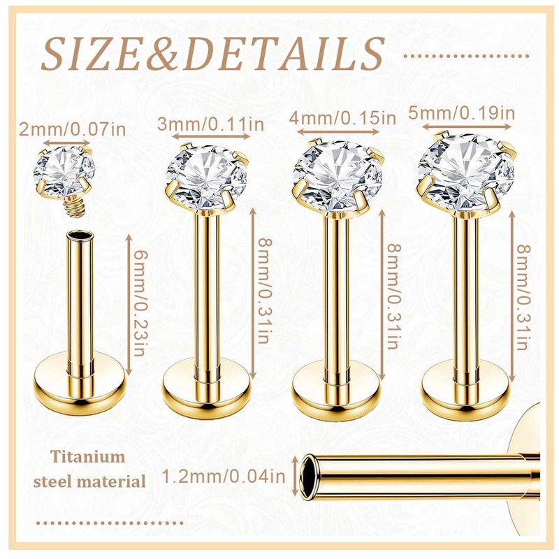 IKOPFLN 4 Pairs 16G G23 Titanium Labret Piercing Internally Threaded Lip Piercing Ear Tragus Piercing Medusa Piercing Cartilage Helix Piercing Gold - 2/3/4/5 mm, AB