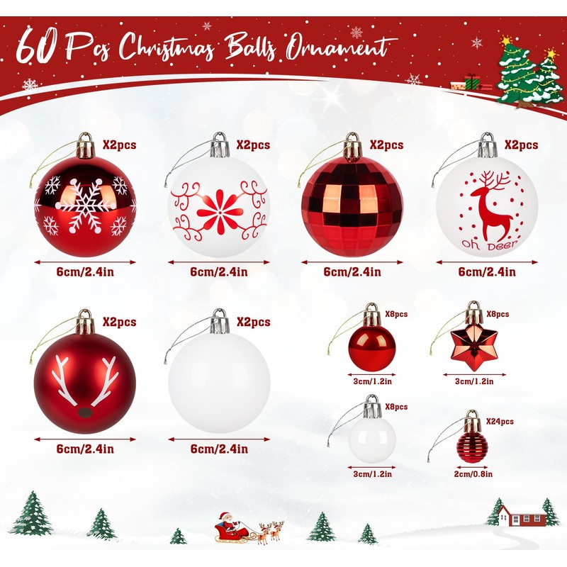 - 60Pcs Christmas Decoration Set - There are 60 Christmas balls in the set. The diameter of the Christmas ball is 6 cm and 3cm. Our Christmas ball set comes with 8 different styles. These hanging ornaments come in different styles to meet all your needs.