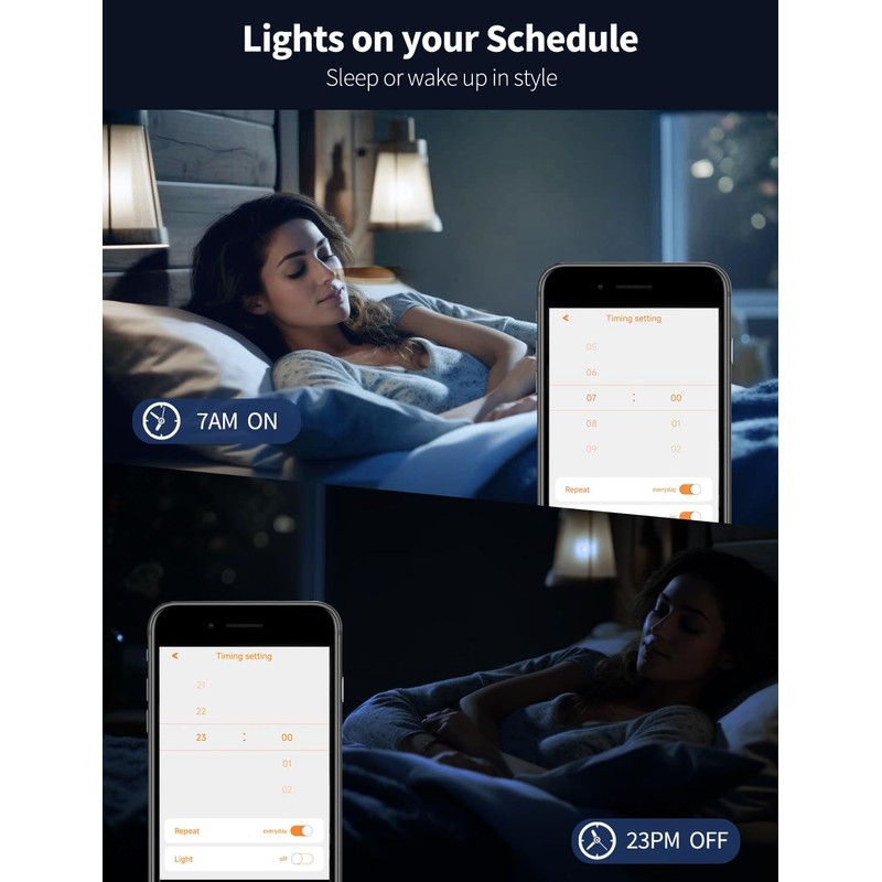 - Smart voice control: Replace the ILC Alexa light bulbs, let your favorite lamp upgrade smart light. Cell phone and voice can control, no longer need to get out of bed to turn off the lights, the light bulb into the Alexa APP, not only support voice dimming, change the color, but also can be timed to turn on the light, delay the light off and other thoughtful settings. (Note: You can experience more lighting modes in BRMesh APP).
