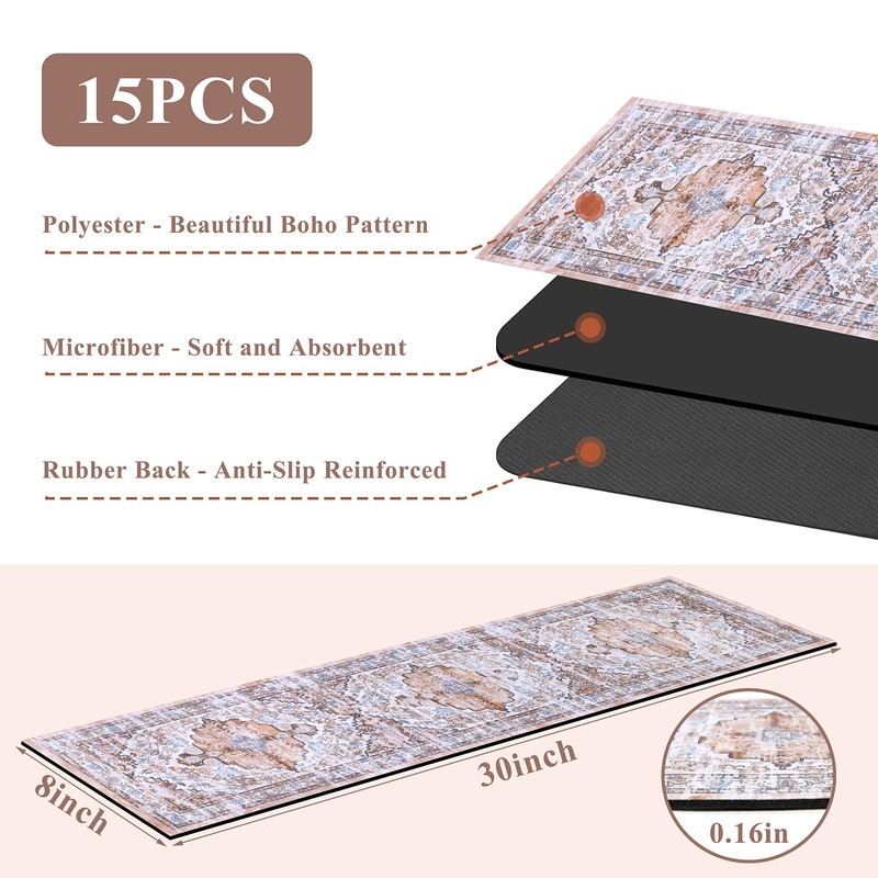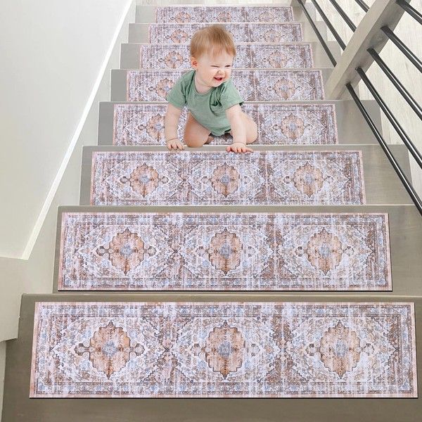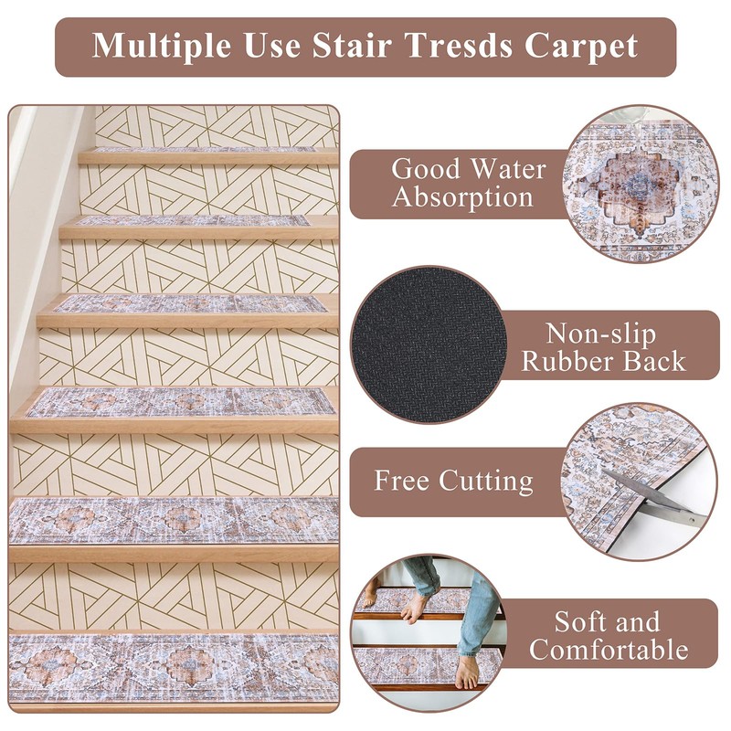 - Suitable Size Carpet Stair Treads: 15 pieces in a pack, each stairway carpet strip measures 8" x 30" , and the size is suitable for most indoor stairs. In addition, these rubber backed stair mats are cuttable, you can cut them into different sizes or shapes according to your needs. The unique and beautiful boho pattern design will add a pop of color to your space.