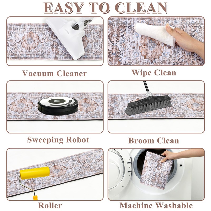 Rubber backing stair runner rug has good water absorbency and is very easy to clean. You can use a rag to wipe, broom, roller, vacuum cleaner to clean, or hand wash and machine wash.