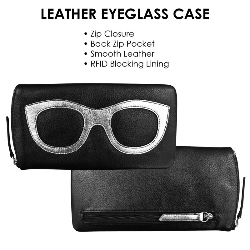 ili New York Smooth Leather Soft Eyeglass Case, Zip Closure with RFID Blocking Lining, Travel-Friendly in Vibrant Colors, Black/Silver