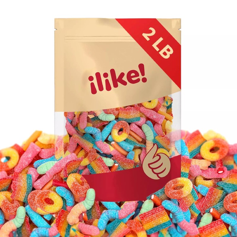 iLike! Gummy Candy Mix 2-Pound Bag, Peach Rings, Pencil Bites, Worms, Bottles, Belts