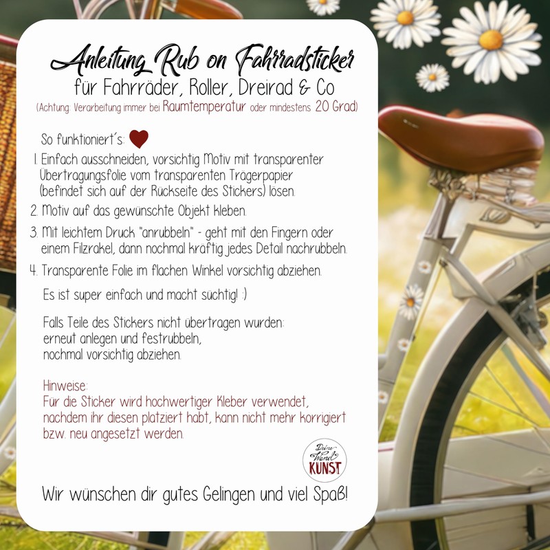 - Instructions for use: 1. Simply cut out, carefully remove the motif with transparent transfer film from the transparent backing paper (located on the back of the sticker). 2. Stick the motif to the desired object. 3. With light pressure "rubbing" - use your fingers or a felt squeegee, then rub again vigorously every detail. 4. Carefully peel off the transparent film at a flat angle. It is super easy and addictive! :) Notes: High-quality glue is used for the stickers, after you have placed it, can no longer be corrected or re-applied.