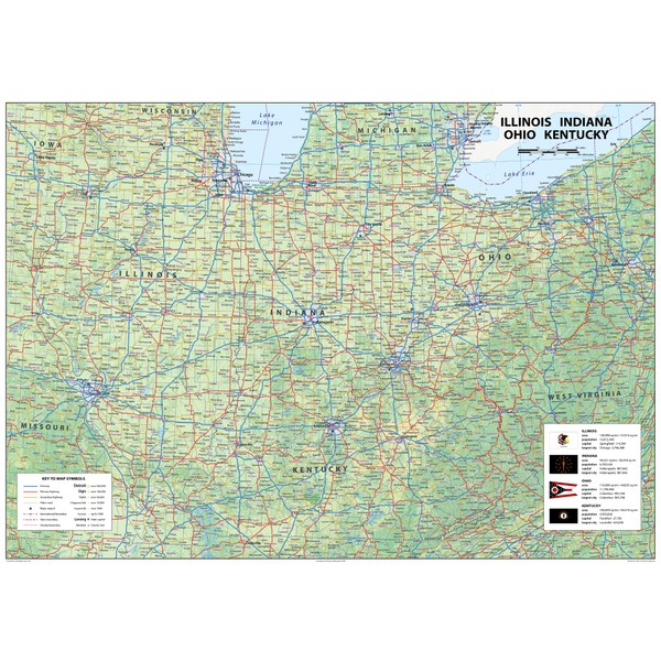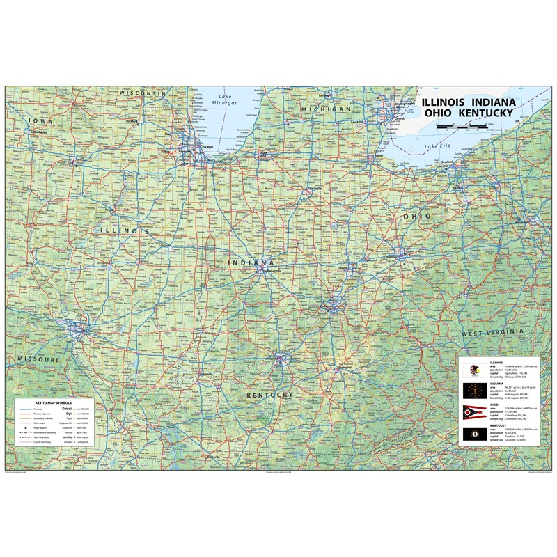 - Outlining the physical features of each state in vivid detail, this map makes it easier for you to identify and explore the surrounding region. From the great economic features of Illinois, the history of Indiana, the vibrant culture of Ohio, and the Bluegrass State of Kentucky, you'll find the perfect starting point for your next big adventure.