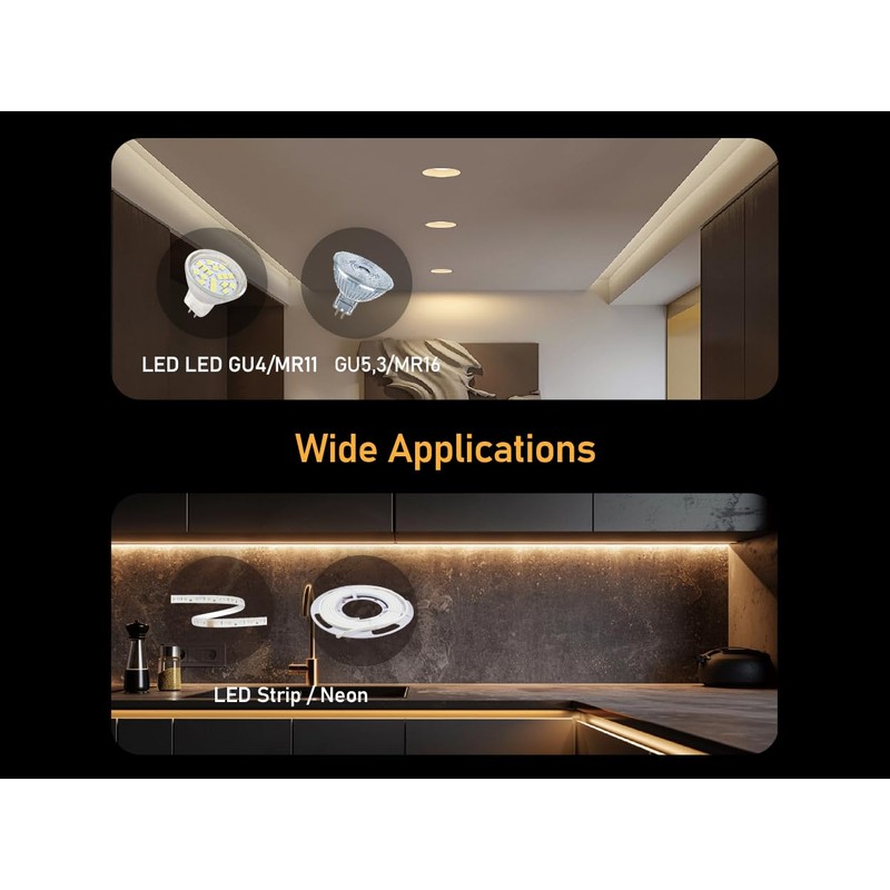 - This dimmable LED power supply can only be dimmed with TRIAC dimmer (phase control) and is more suitable for LED strips. For other LED light sources, such as LED lamp with GU5.3 / MR16 or G4 / MR11 socket, we cannot guarantee compatibility and dimming effect.