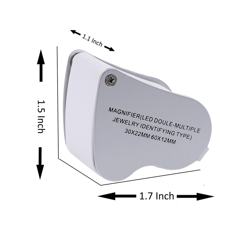 - The dual Illuminated Jeweler Loupe magnification is built in durable high quality Aluminum alloy and plastic, dual bright LED, dual lens (60X 12 mm and 30X 22 mm).