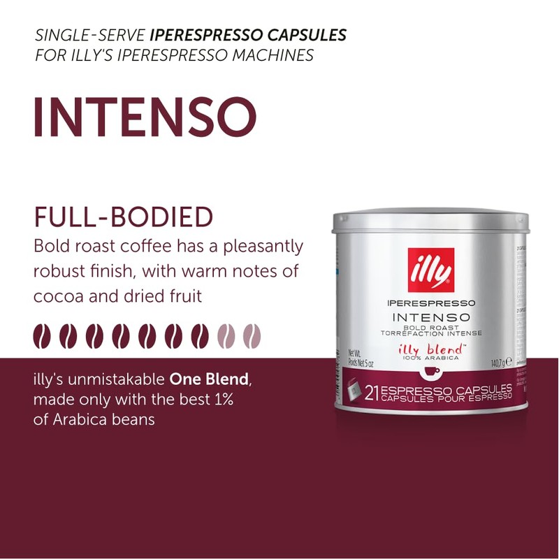 - INTENSE. BOLD. AROMATIC – Full-bodied and bold, illy iperEspresso Capsules with Intenso dark roast have pleasantly robust finish with warm notes of cocoa and dried fruit.