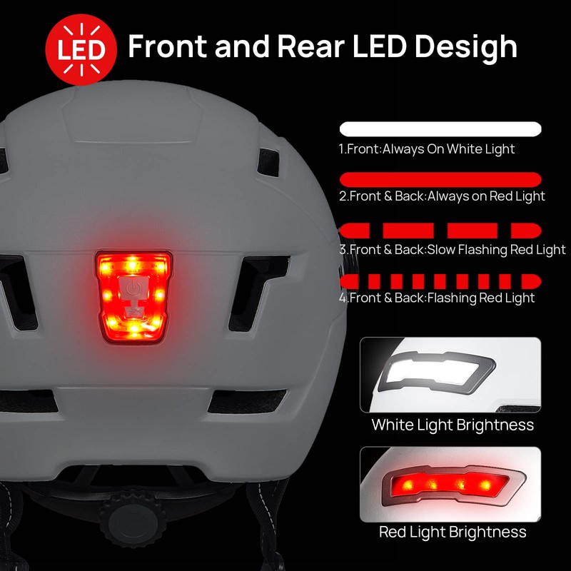 • HIGHLY VISIBILITY This bike helmet is equipped with USB rechargeable front and rear light. While the front lights provide lighting, the rear lights provide higher visibility for the vehicles or people behind you, better protection on the streets of the city; features 4 lighting modes, the bicycle helmet light can be easily changed lighting modes from steady to flashing or flashing by simple clicks button.