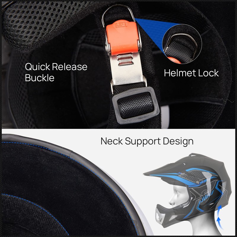 • Ventilation: The helmet has three vents: the one on the chin and the one vent on the head to maximize air circulation. The aerodynamic air intake system can introduce fresh air and replace the hot air in the helmet to ensure that children stay cool when riding off-road bicycles, ATVs, motorcycles and any other off-road sports.