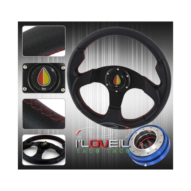 Ilovetacotaco 320mm Blk/Red Drifting Steering Wheel + Blue 1.5" Thin Quick Release + Jdm Horn