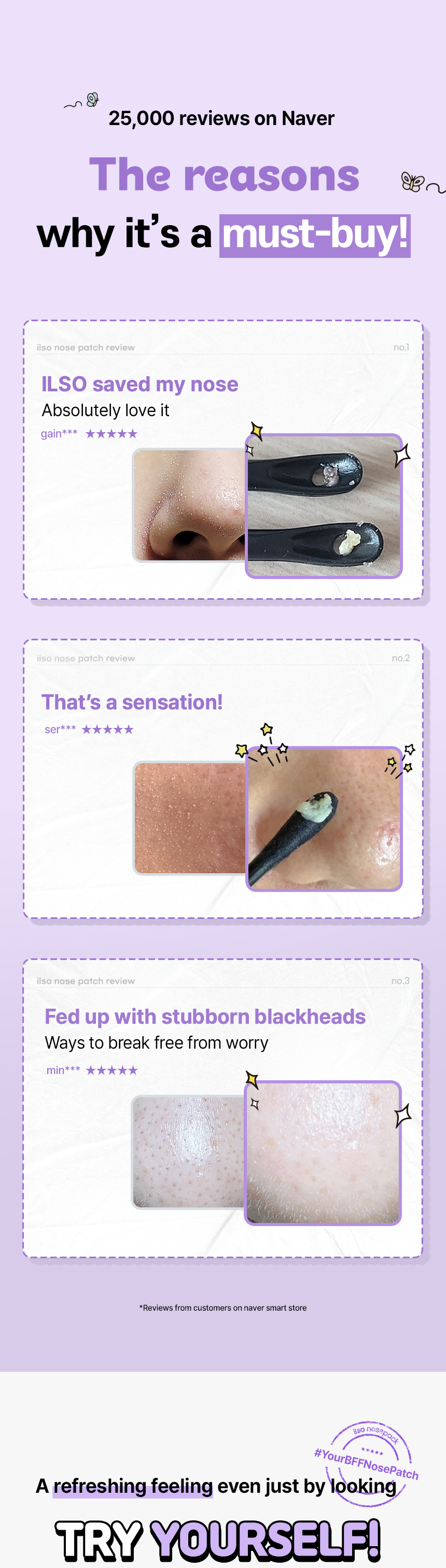 Nose patch that helps gently and easily remove blackheads. It helps reduce blackheads without unwanted irritation. Ultra-fine mesh structure of coconut ferment cellulose sheet provides super fit on the nose and enhanced delivery of ingredients. Cellulose sheet seamlessly hugs the curves and maintains moisture longer on the skin. The sheet is compressed with water at high pressure so it can be optimally enriched with pore refining & soothing essence formula. Slit design enhances application on the bridge and base of the nose. Alkaline formula gently melts away blackheads and excess sebum and slightly acid formula works to promote healthy pH balance. Completed the low-irritation test. Great for gentle removal of black/whiteheads, excess sebum on the nose and T-zone, and pore refining or sebum control all-in-one solution with soothing care.
